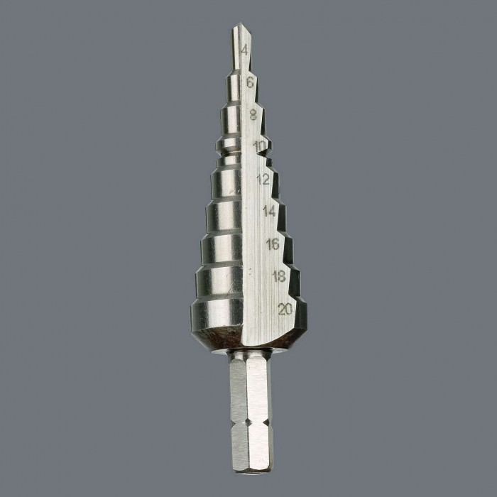 Бита-сверло ступенчатое 4-20 мм шаг 2 мм для жести 1 мм 75 мм 1/4" C6.3 серия 843/1 Wera WE-104672