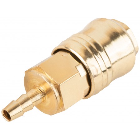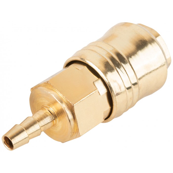 Адаптер с запорным клапаном. Внутреннее быстросъемное соединение - адаптер-соединитель (елочка) 6 мм. С прямым подключением шланга, под ключ S=20. Совместим с ниппелями всех типов. Материал: латунь.