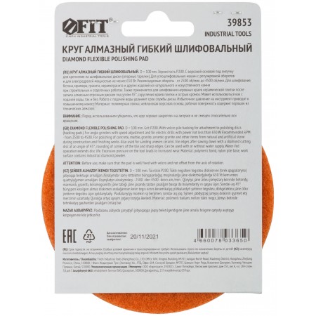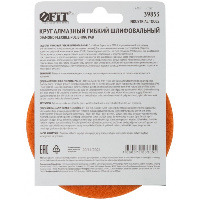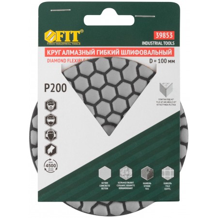 С ворсовой основой под липучку для крепления на шлифовальные диски (опорные тарелки). Для углошлифовальных машин с регулировкой оборотов и электродрелей мощностью не менее 650 Вт. Для шлифования и полирования бетона, мрамора, гранита, керамогранита, кафеля и других изделий. Также применяется для шлифования неровных краев керамической плитки после запила алмазным диском под углом 45° (39851-39854). Может использоваться как с подачей воды, так и без. Материал: полимерная связка, нейлоновая ворсовая основа, рабочая поверхность содержит порошок из технических алмазов. Упаковка: картонный конверт.