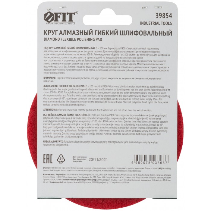С ворсовой основой под липучку для крепления на шлифовальные диски (опорные тарелки). Для углошлифовальных машин с регулировкой оборотов и электродрелей мощностью не менее 650 Вт. Для шлифования и полирования бетона, мрамора, гранита, керамогранита, кафеля и других изделий. Также применяется для шлифования неровных краев керамической плитки после запила алмазным диском под углом 45° (39851-39854). Может использоваться как с подачей воды, так и без. Материал: полимерная связка, нейлоновая ворсовая основа, рабочая поверхность содержит порошок из технических алмазов. Упаковка: картонный конверт.