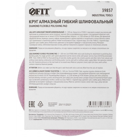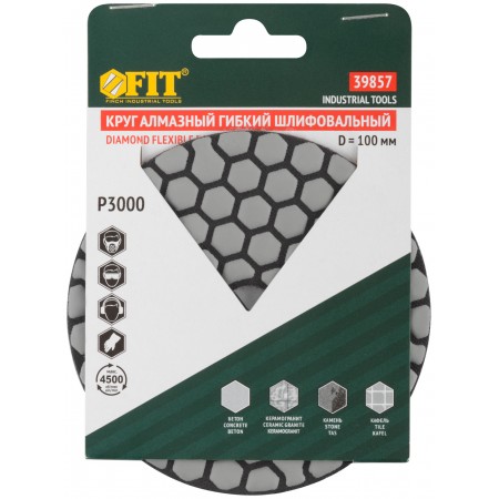 С ворсовой основой под липучку для крепления на шлифовальные диски (опорные тарелки). Для углошлифовальных машин с регулировкой оборотов и электродрелей мощностью не менее 650 Вт. Для шлифования и полирования бетона, мрамора, гранита, керамогранита, кафеля и других изделий. Также применяется для шлифования неровных краев керамической плитки после запила алмазным диском под углом 45° (39851-39854). Может использоваться как с подачей воды, так и без. Материал: полимерная связка, нейлоновая ворсовая основа, рабочая поверхность содержит порошок из технических алмазов. Упаковка: картонный конверт.