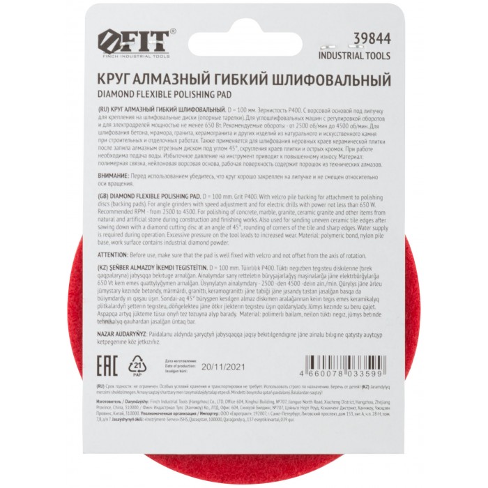 С ворсовой основой под липучку для крепления на шлифовальные диски (опорные тарелки). Для углошлифовальных машин с регулировкой оборотов и электродрелей мощностью не менее 650 Вт. Для шлифования и полирования бетона, мрамора, гранита, керамогранита, кафеля и других изделий. Также применяется для шлифования неровных краев керамической плитки после запила алмазным диском под углом 45° (39841-39844). При работе необходима подача воды. Материал: полимерная связка, нейлоновая ворсовая основа, рабочая поверхность содержит порошок из технических алмазов. Упаковка: картонный конверт.