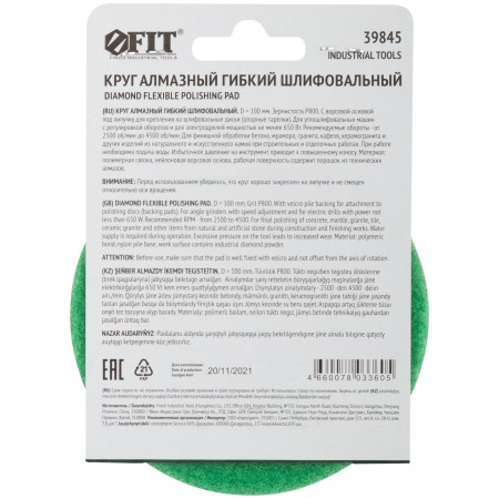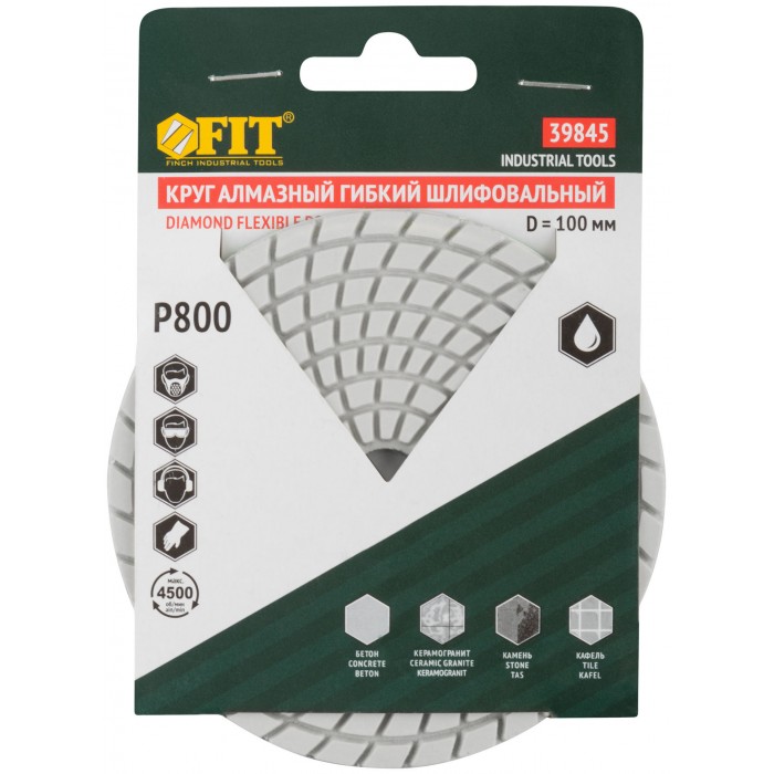 С ворсовой основой под липучку для крепления на шлифовальные диски (опорные тарелки). Для углошлифовальных машин с регулировкой оборотов и электродрелей мощностью не менее 650 Вт. Для шлифования и полирования бетона, мрамора, гранита, керамогранита, кафеля и других изделий. Также применяется для шлифования неровных краев керамической плитки после запила алмазным диском под углом 45° (39841-39844). При работе необходима подача воды. Материал: полимерная связка, нейлоновая ворсовая основа, рабочая поверхность содержит порошок из технических алмазов. Упаковка: картонный конверт.