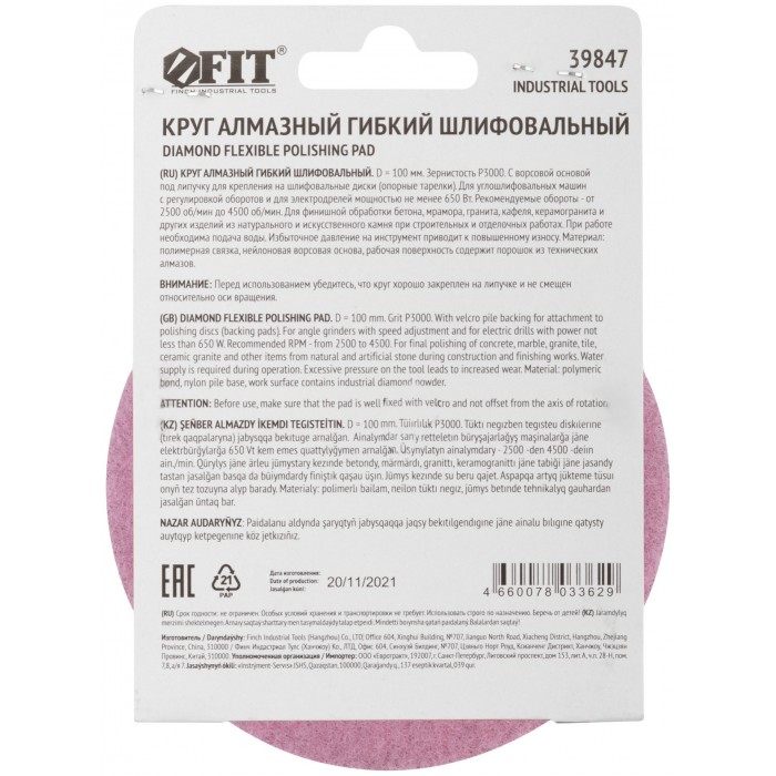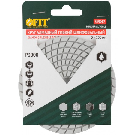 С ворсовой основой под липучку для крепления на шлифовальные диски (опорные тарелки). Для углошлифовальных машин с регулировкой оборотов и электродрелей мощностью не менее 650 Вт. Для шлифования и полирования бетона, мрамора, гранита, керамогранита, кафеля и других изделий. Также применяется для шлифования неровных краев керамической плитки после запила алмазным диском под углом 45° (39841-39844). При работе необходима подача воды. Материал: полимерная связка, нейлоновая ворсовая основа, рабочая поверхность содержит порошок из технических алмазов. Упаковка: картонный конверт.