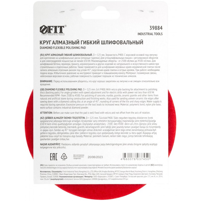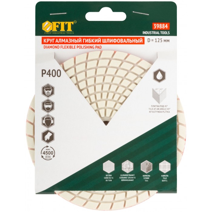 С ворсовой основой под липучку для крепления на шлифовальные диски (опорные тарелки). Для углошлифовальных машин с регулировкой оборотов и электродрелей мощностью не менее 650 Вт. Для шлифования и полирования бетона, мрамора, гранита, керамогранита, кафеля и других изделий. Также применяется для шлифования неровных краев керамической плитки после запила алмазным диском под углом 45° (39841-39844). При работе необходима подача воды. Материал: полимерная связка, нейлоновая ворсовая основа, рабочая поверхность содержит порошок из технических алмазов. Упаковка: картонный конверт.