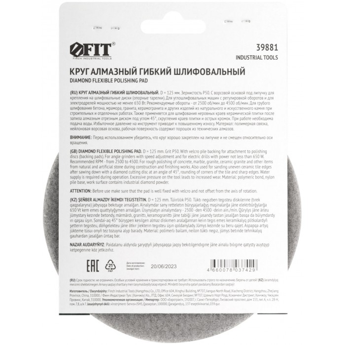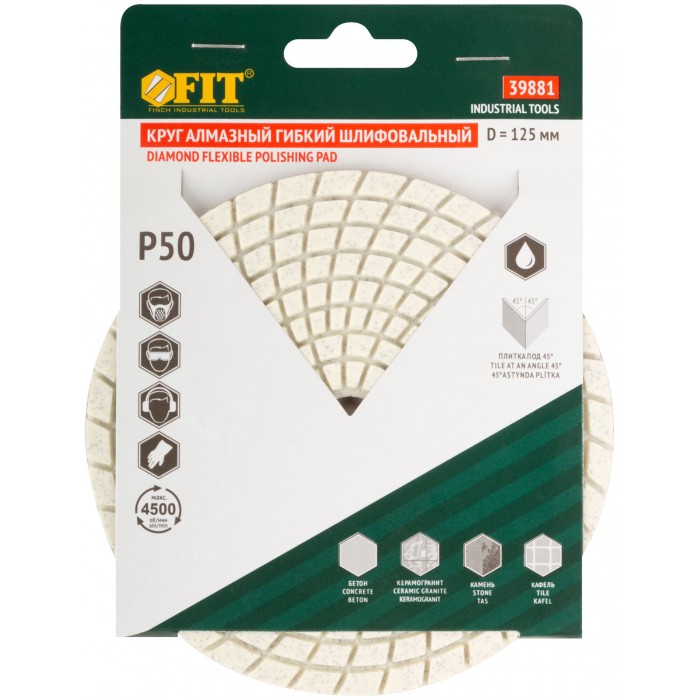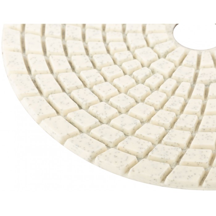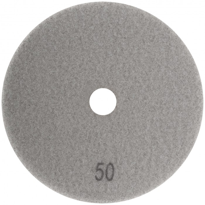 С ворсовой основой под липучку для крепления на шлифовальные диски (опорные тарелки). Для углошлифовальных машин с регулировкой оборотов и электродрелей мощностью не менее 650 Вт. Для шлифования и полирования бетона, мрамора, гранита, керамогранита, кафеля и других изделий. Также применяется для шлифования неровных краев керамической плитки после запила алмазным диском под углом 45° (39841-39844). При работе необходима подача воды. Материал: полимерная связка, нейлоновая ворсовая основа, рабочая поверхность содержит порошок из технических алмазов. Упаковка: картонный конверт.