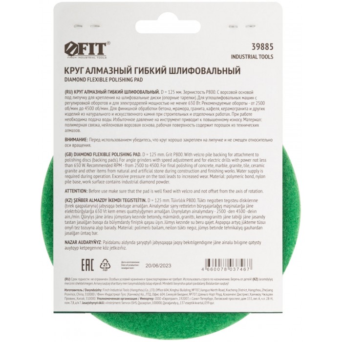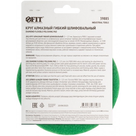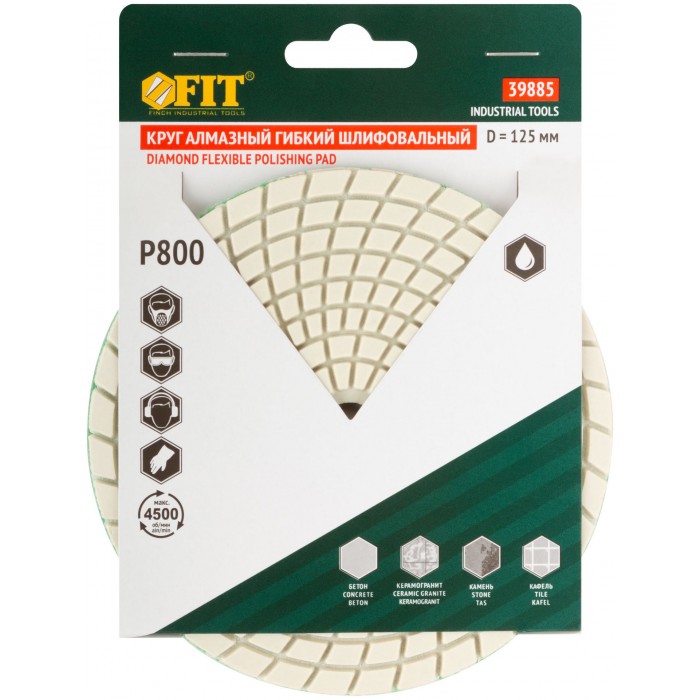 С ворсовой основой под липучку для крепления на шлифовальные диски (опорные тарелки). Для углошлифовальных машин с регулировкой оборотов и электродрелей мощностью не менее 650 Вт. Для шлифования и полирования бетона, мрамора, гранита, керамогранита, кафеля и других изделий. Также применяется для шлифования неровных краев керамической плитки после запила алмазным диском под углом 45° (39841-39844). При работе необходима подача воды. Материал: полимерная связка, нейлоновая ворсовая основа, рабочая поверхность содержит порошок из технических алмазов. Упаковка: картонный конверт.