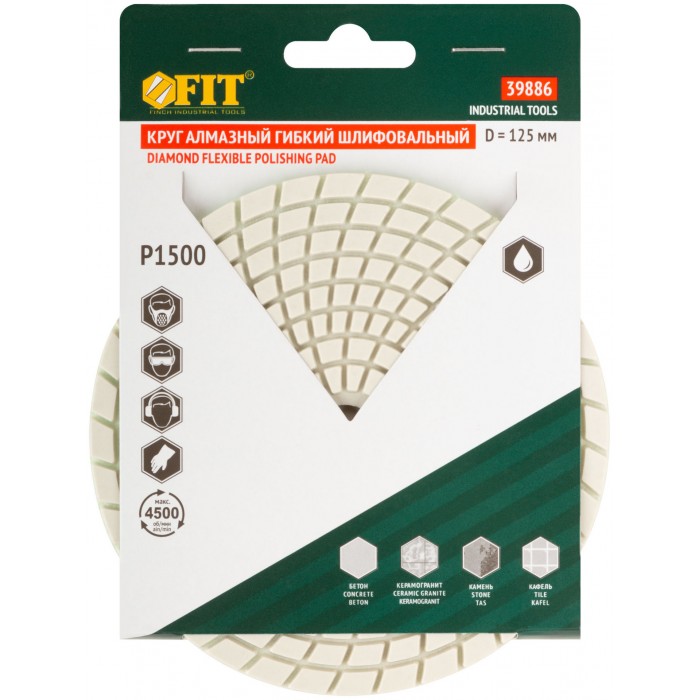 С ворсовой основой под липучку для крепления на шлифовальные диски (опорные тарелки). Для углошлифовальных машин с регулировкой оборотов и электродрелей мощностью не менее 650 Вт. Для шлифования и полирования бетона, мрамора, гранита, керамогранита, кафеля и других изделий. Также применяется для шлифования неровных краев керамической плитки после запила алмазным диском под углом 45° (39841-39844). При работе необходима подача воды. Материал: полимерная связка, нейлоновая ворсовая основа, рабочая поверхность содержит порошок из технических алмазов. Упаковка: картонный конверт.