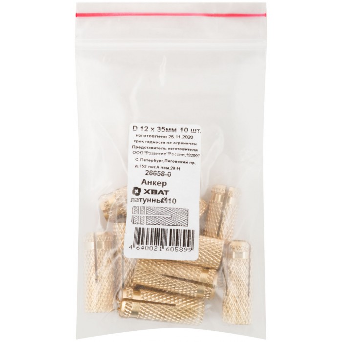 Анкер латунный М10, D 12х35 мм 10 шт Фасовка (26658-0)