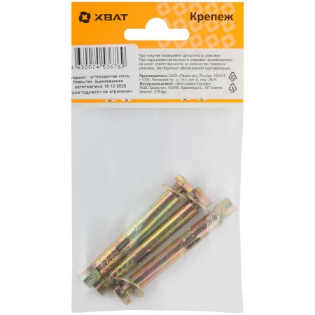 Втулка, болт и конус изготовлены из стали с электроцинкованным покрытием желтого цвета. Применяется для крепления различных тяжеловесных конструкций в полнотелых материалах (бетон, корпич, естественный камень).