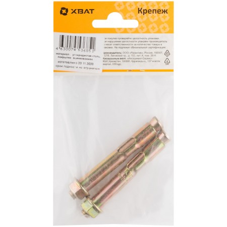 Втулка, шпилька с конусом и гайка изготовлены из стали с электроцинкованным покрытием желтого цвета. Применяется для крепления различных тяжеловесных конструкций в полнотелых материалах (бетон, корпич, естественный камень).
