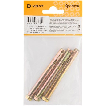Втулка, шпилька с конусом и гайка изготовлены из стали с электроцинкованным покрытием желтого цвета. Применяется для крепления различных тяжеловесных конструкций в полнотелых материалах (бетон, корпич, естественный камень).