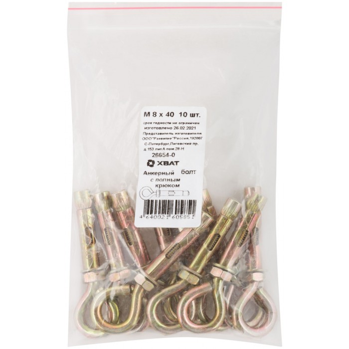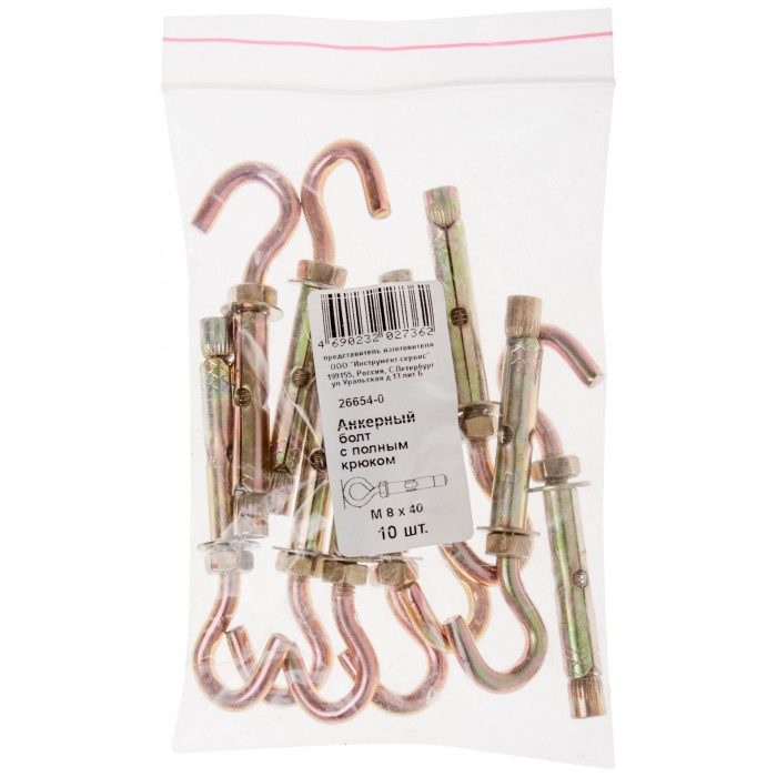 Анкерный болт с полным крюком М 8 х 40 10 шт Фасовка (26654-0)