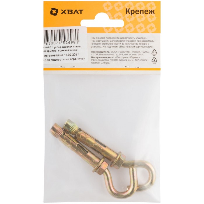 С крюком. Используется для крепления тяжеловесных конструкций к полнотелому бетону, природному строительному камню, полнотелому кирпичу. Может применяться для крепления к тонким бетонным перегородкам. Изготовлен из стали, поверхность оцинкована и пассивирована.
