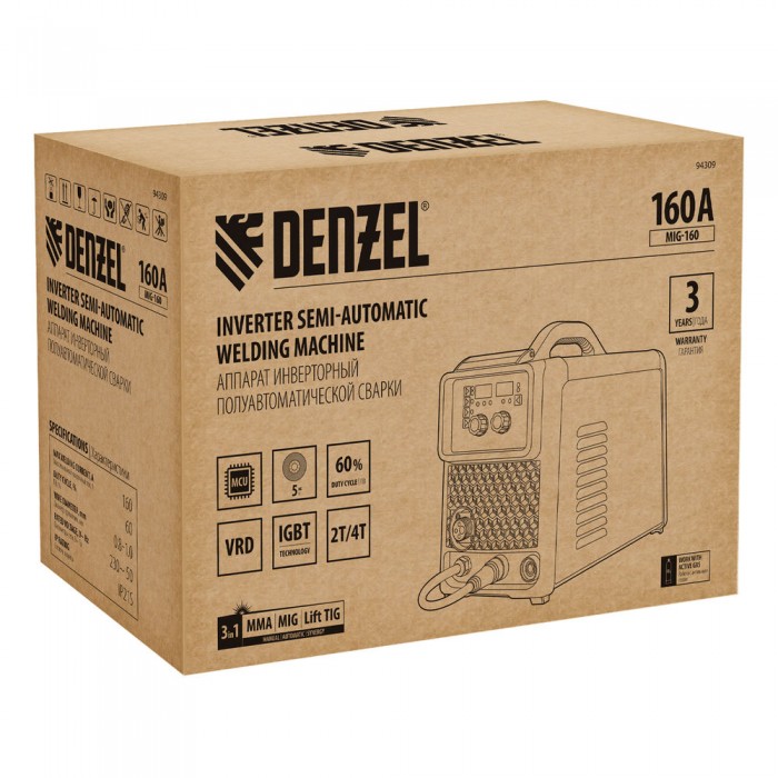 Аппарат инвертор. полуавтомат. сварки MIG-160, 160 А, ПВ 60%, катушка 5 кг// Denzel (94309)