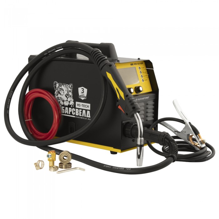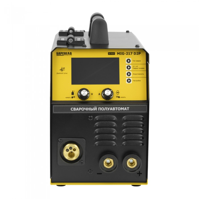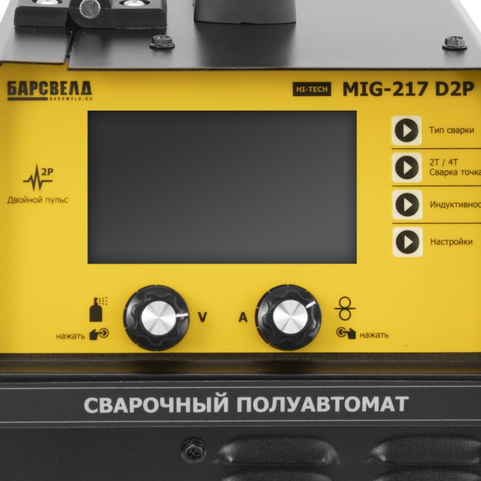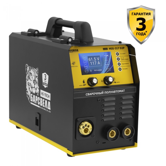 БАРСВЕЛД Hi-Tech MIG-217 D2P – профессиональный полуавтомат, способный заменить сразу несколько сварочных аппаратов! Ручная дуговая сварка металлоконструкций из низкоуглеродистой стали, полуавтоматическая сварка изделий из нержавейки или аргонодуговая сварка алюминиевых деталей – для БАРСВЕЛД Hi-Tech MIG-217 D2P практически нет невыполнимых задач! Надежная сварка В аппарате используется передовая система двойной пульсации дуги - Double Pulse, которая обеспечивает сконцентрированный нагрев металла и, как следствие более глубокое проплавление корня шва. Кроме того, такой режим работы позволяет получить красивый и гладкий сварочный шов, а также снижает расход электроэнергии. БАРСВЕЛД Hi-Tech MIG-217 D2P приспособлен для постановки электрозаклепок – сварочных точек одинакового размера, которые будут очень кстати не только для прихвата, но и для быстрого соединения тонкостенных заготовок. Быстрая настройка В отличии от большинства конкурентов, БАРСВЕЛД Hi-Techi MIG-217 D2P оснащается цветным LCD дисплеем. Его большие размеры и разделенное на блоки русскоязычное меню позволяет не только быстро сменить режим сварки, но и установить необходимое значение силы тока в диапазоне от 10 до 200 А, время предварительной и завершающей продувки сварочной ванны газом, а также выставить индуктивность дуги и другие необходимые параметры. Яркая подсветка дисплея и крупная индикация обеспечивают хорошую считываемость информации даже на большом удалении от аппарата. Широкие функциональные возможности, высокое значение силы сварочного тока и легкость управления сделали аппарат незаменимым помощником на строительных площадках, СТО или в производственных цехах. Высокая мобильность Использование современных цифровых модулей значительно снизило вес и размеры аппарата –его можно без особых усилий перемещать по рабочей площадке просто взявшись за рукоятку, расположенную в верхней части корпуса. Чтобы БАРСВЕЛД Hi-Tech MIG-217 D2P было удобнее использовать, производитель оснастил его встроенным механизмом подачи закрытого типа. Это значительно улучшило качество сварки, так как на поверхность проволоки не попадают частички грязи и пыли, а сама проволока надежно защищена от механических повреждений. БАРСВЕЛД Hi-Tech MIG-217 D2P – универсальный сварочный полуавтомат с 3-х летней заводской гарантией, который всегда будет радовать вас отличным качеством сварочных швов!
