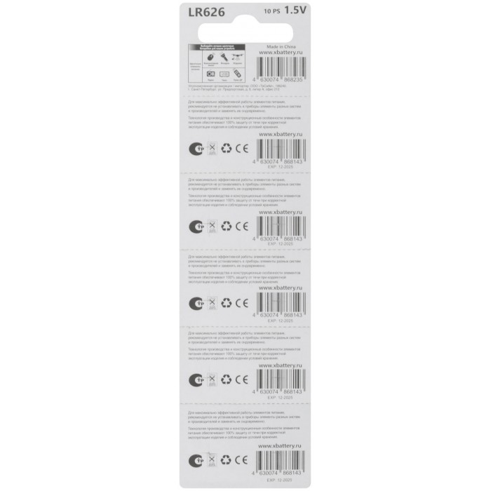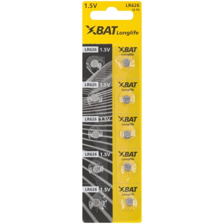 LR626 (AG4), 1,5 В, 17 мА/ч, 0,34 г. Расчетное удержание заряда при 20 °С: после 12 месяцев хранения 85%; после 24 месяцев хранения 65%. Упаковка: блистер.