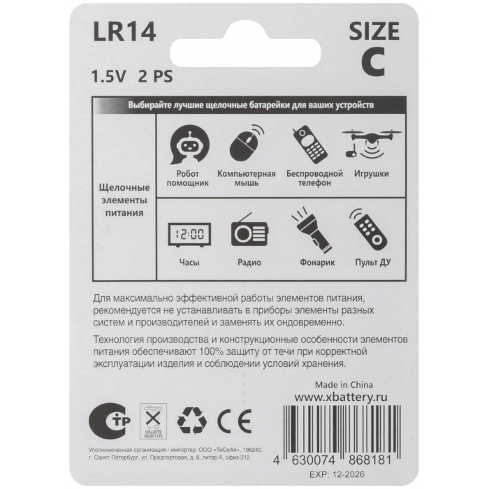Батарейка щелочная, 1.5 В, тип C, 2 шт. (LR14-2BPC)