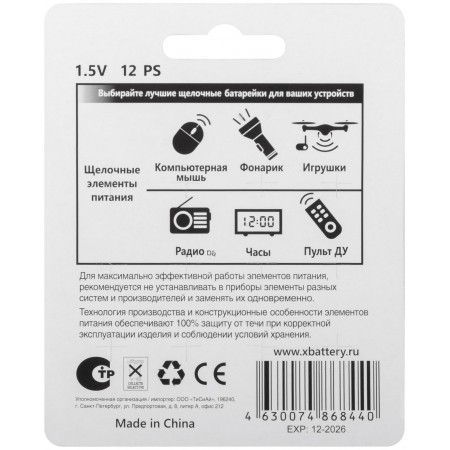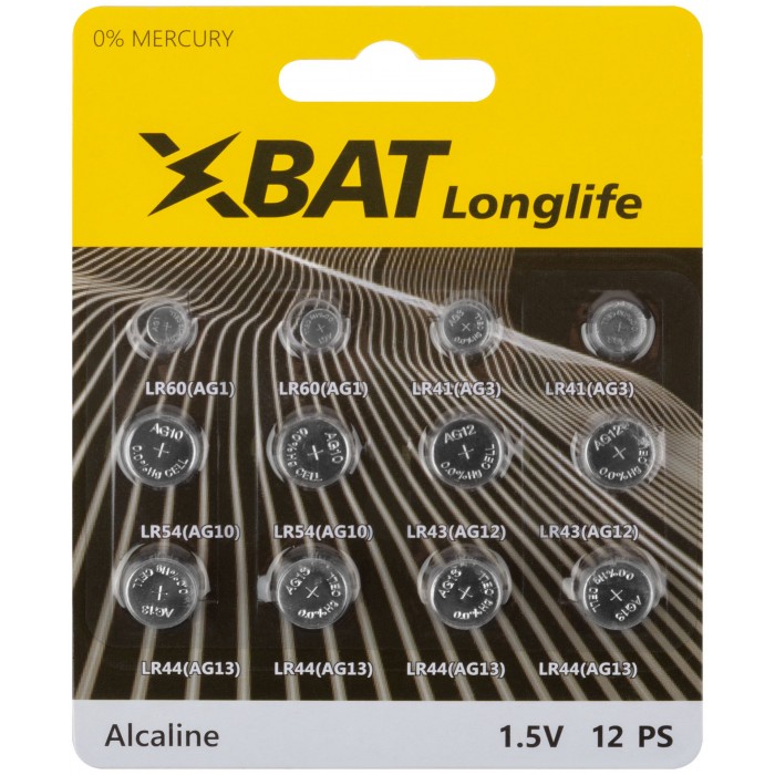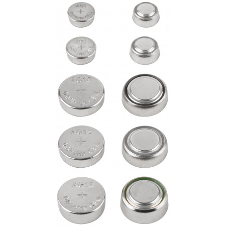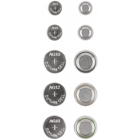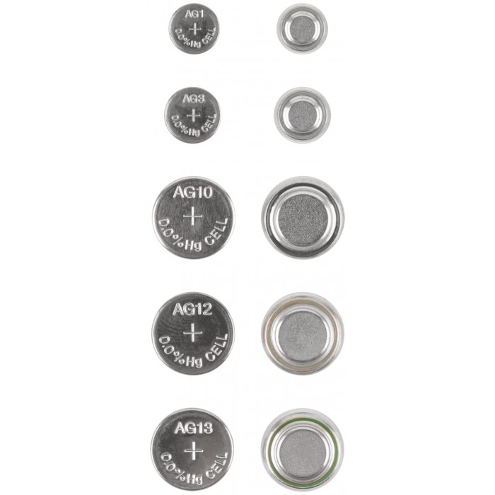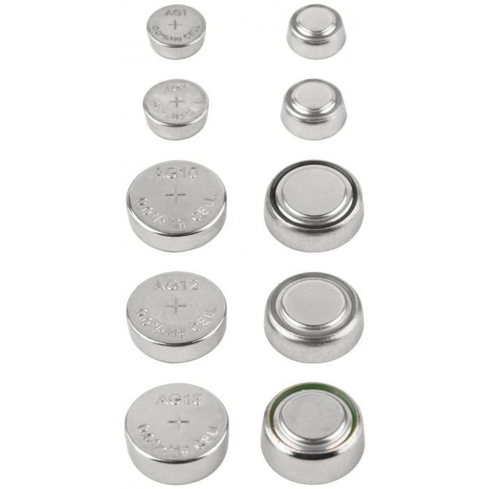 Набор разных типоразмеров (1,5 В, 15-100 мА/ч). Состав набора: LR60 (AG1) - 2 шт. LR41 (AG3) - 2 шт. LR54 (AG10) - 2 шт. LR43 (AG12) - 2 шт. LR44 (AG13) - 4 шт. Упаковка: блистер.