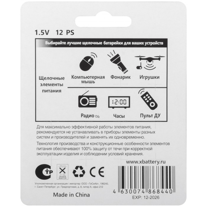 Батарейка щелочная, тип AG1*2 шт, AG3*2 шт, AG10*2 шт, AG12*2 шт, AG13*4 шт (SETLR-12BPC)
