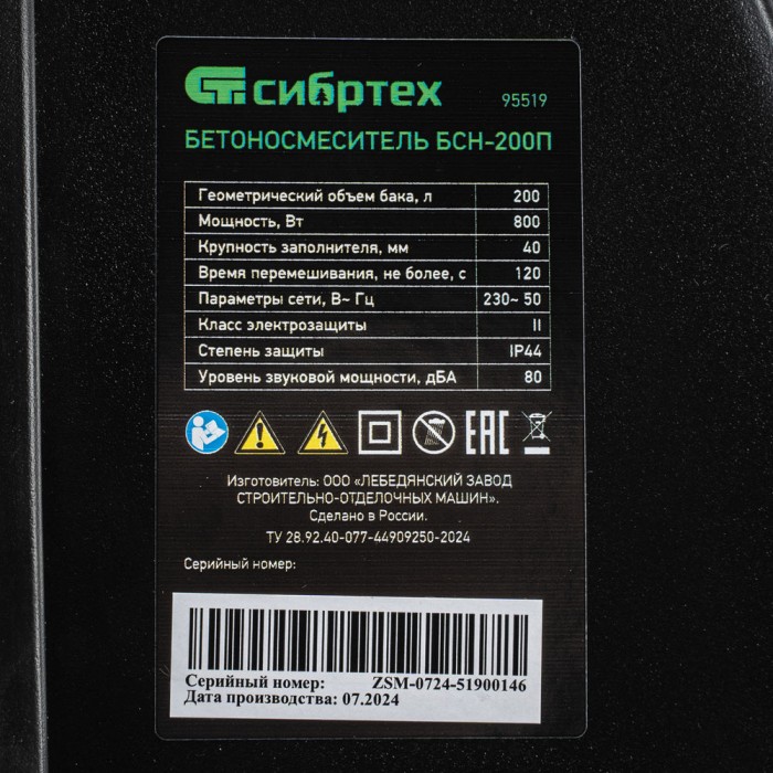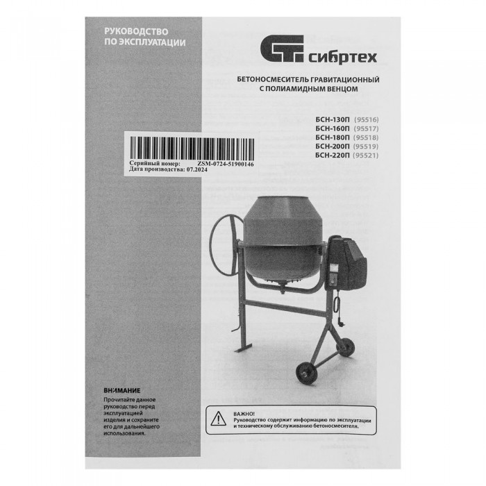 Бетоносмеситель БСН-200П, мощность 800 Вт, полиамидный венец Сибртех (95519)