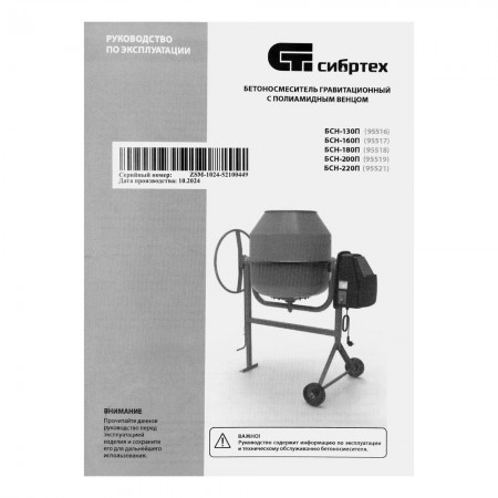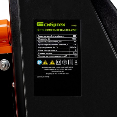 Бетоносмеситель БСН-220П, мощность 1000 Вт, полиамидный венец Сибртех (95521)