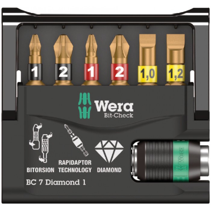 Набор бит торсионных с битодержателем Rapidaptor 7 Diamond 1, алмаз, 7 пр., 1/4" C6.3 Bit-Check WE-057416