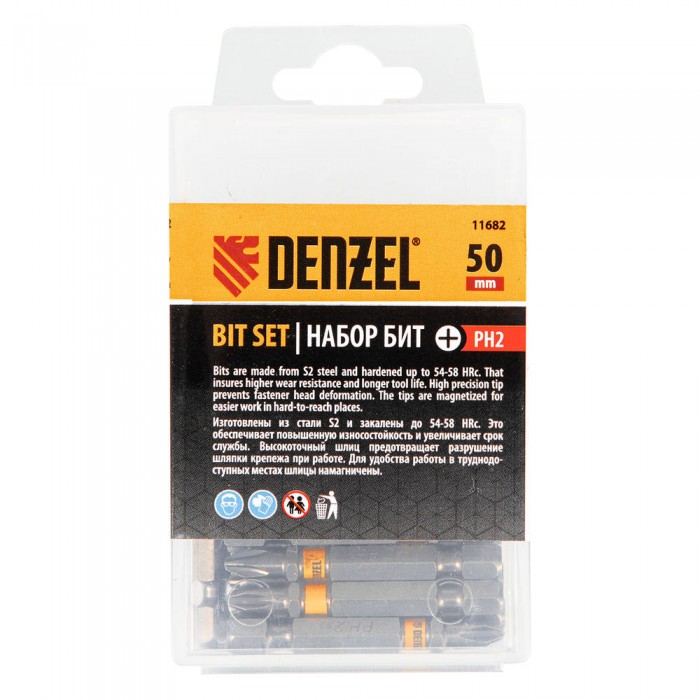 Бита PH2х50, сталь легированная S2, 30 шт., шестигранный профиль, пластиковая коробка, Е 6,3 Denzel (11682)