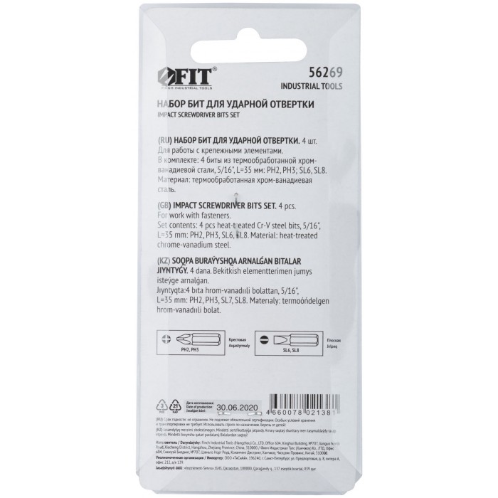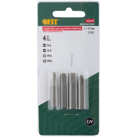 Набор 4 шт. х 35 мм. PH2, PH3, SL6, SL8. Посадочный размер 5/16''. Материал: хром-ванадиевая сталь. Упаковка: блистер.