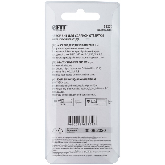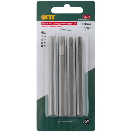 Набор 4 шт. х 80 мм. PH2, PH3, SL6, SL8. Посадочный размер 5/16''. Материал: хром-ванадиевая сталь. Упаковка: блистер.