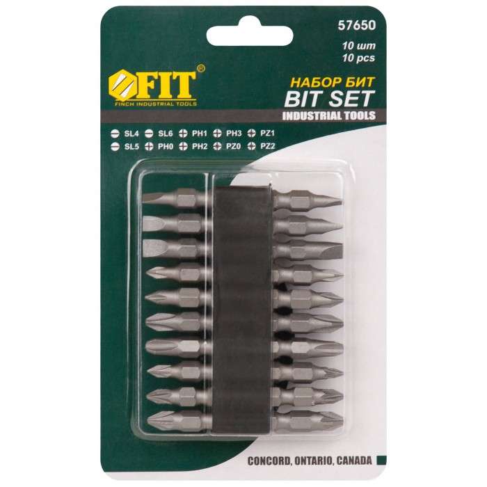 Двухсторонние. В наборе: 10 бит из хром-ванадиевой стали длиной 65 мм (SL4; SL5; SL6; PH0; PH1; PH2; PH3; PZ0; PZ1; PZ2). Упаковка: блистер.