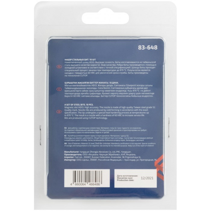 Намагниченный шлиц, антискользящие риски. Высокая точность. Биты изготавливается из тайваньской стали высшего качества марки S2. Знак качества. Ребра биты производятся с помощью холодной штамповки в соответствии с точной спецификацией. Кончик проходит специальный процесс закалки при температурах до 870°C. Результатом является насадка с твердостью 60 HRC для увеличения срока службы. Биты произведены по технологии CUTOP. Ресурс биты от 2000 шт. саморезов (собственные испытания, проведенные на саморезах по дереву 3,5х41). Упаковка: картонный подвес.