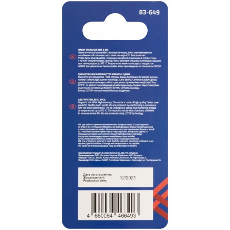 Намагниченный шлиц, антискользящие риски. Высокая точность. Биты изготавливается из тайваньской стали высшего качества марки S2. Знак качества. Ребра биты производятся с помощью холодной штамповки в соответствии с точной спецификацией. Кончик проходит специальный процесс закалки при температурах до 870°C. Результатом является насадка с твердостью 60 HRC для увеличения срока службы. Биты произведены по технологии CUTOP. Ресурс биты от 2000 шт. саморезов (собственные испытания, проведенные на саморезах по дереву 3,5х41). Упаковка: картонный подвес.