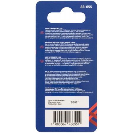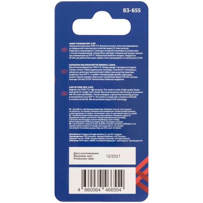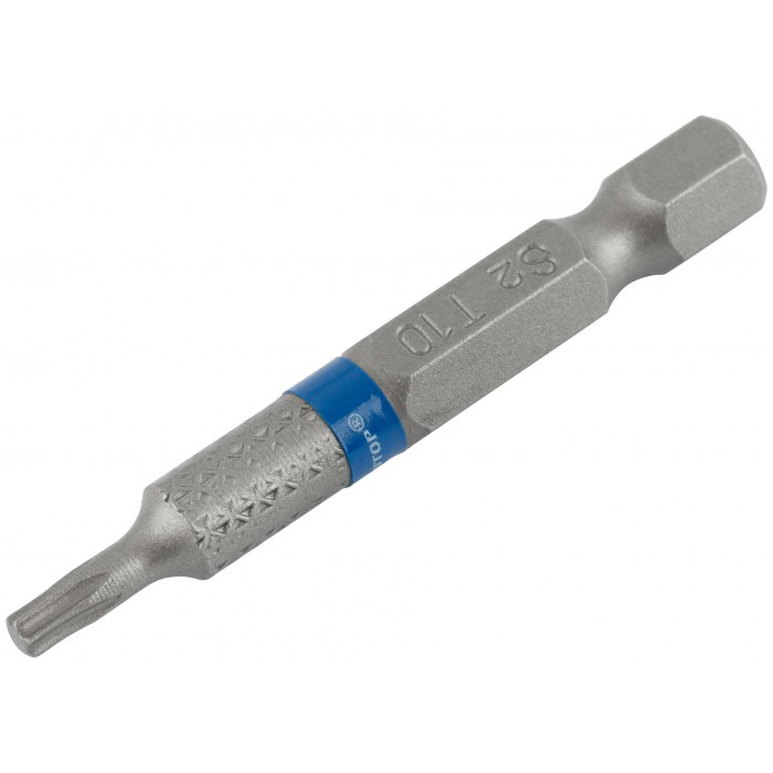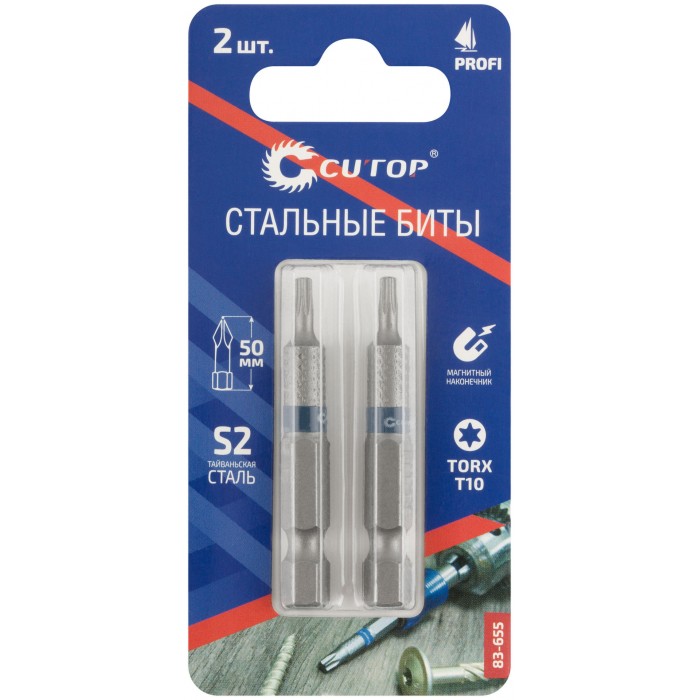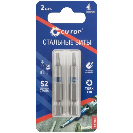 Намагниченный шлиц, антискользящие риски. Высокая точность. Биты изготавливается из тайваньской стали высшего качества марки S2. Знак качества. Ребра биты производятся с помощью холодной штамповки в соответствии с точной спецификацией. Кончик проходит специальный процесс закалки при температурах до 870°C. Результатом является насадка с твердостью 60 HRC для увеличения срока службы. Биты произведены по технологии CUTOP. Ресурс биты от 2000 шт. саморезов (собственные испытания, проведенные на саморезах по дереву 3,5х41). Упаковка: картонный подвес.