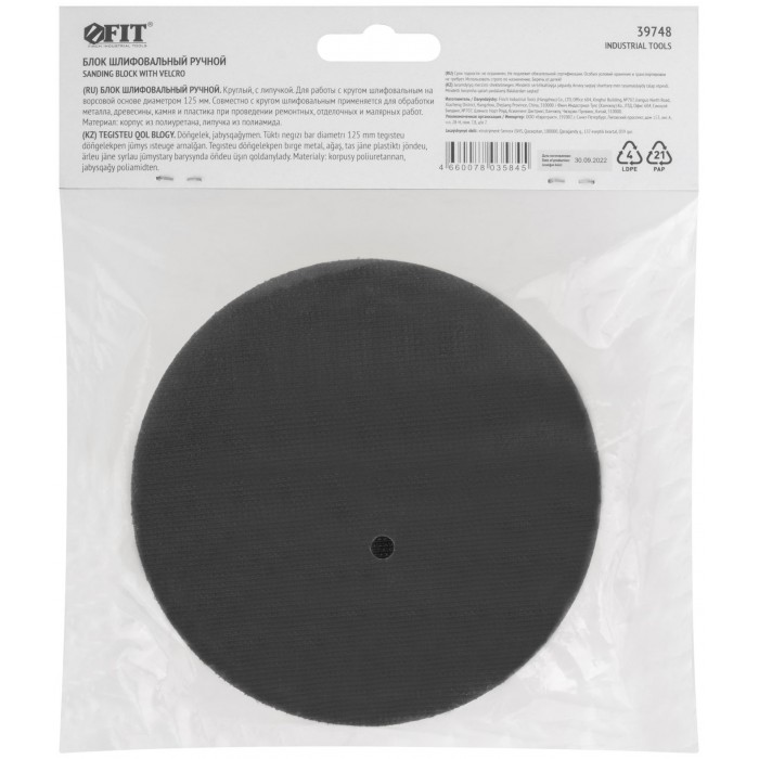 Круглый. С липучкой. Для работы с кругом шлифовальным на ворсовой основе диаметром 125 мм. Материал: корпус из полиуретана, липучка из полиамида. Упаковка: П/Э пакет с картонным подвесом.