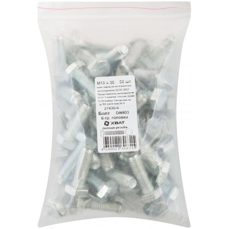 Болт 6-гранная головка (полная резьба) М10 х 30 50 шт DIN933 Фасовка (27430-0)