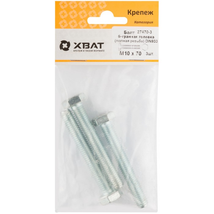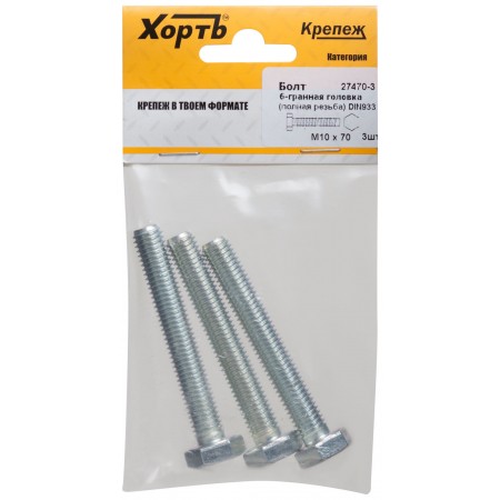 Болт 6-гранная головка (полная резьба) М10 х 70 DIN933 (фасовка 3 шт.) (27470-3)