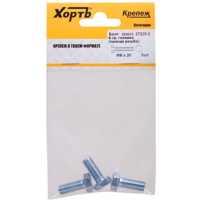 Болт 6-гранная головка (полная резьба) М8 х 20 ( фасовка 3 шт ) DIN933 (27220-2)