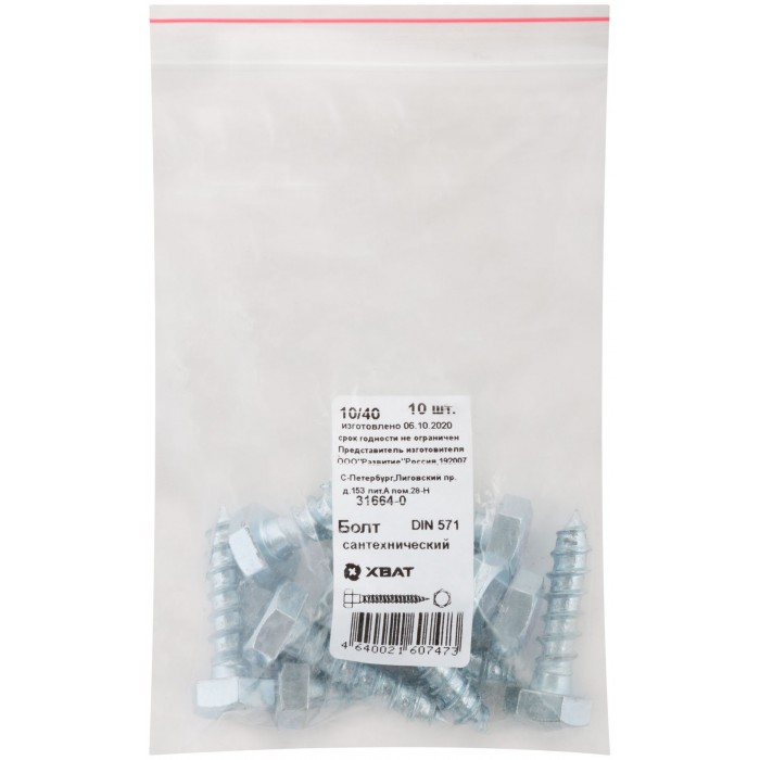 Болт сантехнический 10х40 мм DIN 571, 10 шт 31664-0