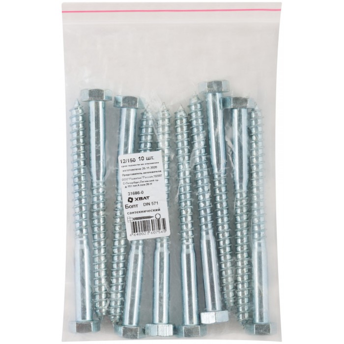 Болт сантехнический 12х150 мм DIN 571, 10 шт 31686-0