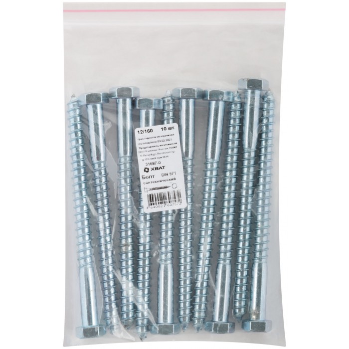Болт сантехнический 12х160 мм DIN 571, 10 шт 31687-0
