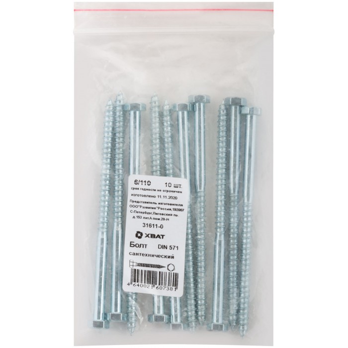 Болт сантехнический 6х110 мм DIN 571, 10 шт 31611-0