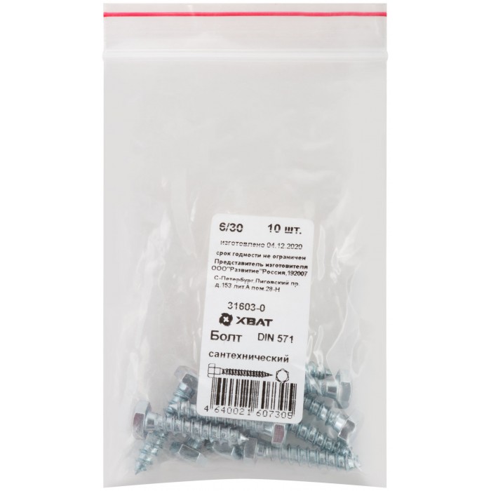 Болт сантехнический 6х30 мм DIN 571, 10 шт 31603-0