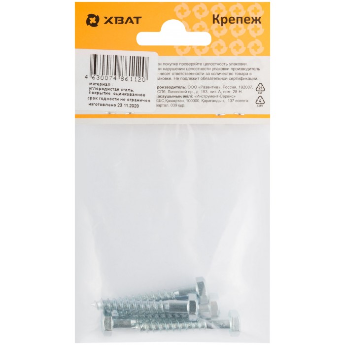 Шестигранная головка D=10/12/14/19. Редкий шаг резьбы под углом 600, острый наконечник, изготовлен из стали. Оцинкованный. Применяется для крепления лаг, реек, сборки деревянных конструкций, сантехнических креплений и других целей, когда требуется мощное закрепление. Используется также совместно с пластмассовыми и металлическими универсальными дюбелями.