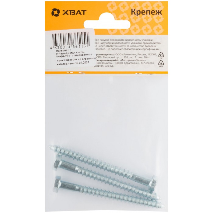 Шестигранная головка D=10/12/14/19. Редкий шаг резьбы под углом 600, острый наконечник, изготовлен из стали. Оцинкованный. Применяется для крепления лаг, реек, сборки деревянных конструкций, сантехнических креплений и других целей, когда требуется мощное закрепление. Используется также совместно с пластмассовыми и металлическими универсальными дюбелями.
