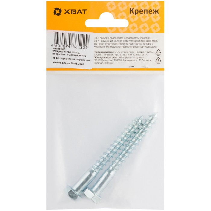 Шестигранная головка D=10/12/14/19. Редкий шаг резьбы под углом 600, острый наконечник, изготовлен из стали. Оцинкованный. Применяется для крепления лаг, реек, сборки деревянных конструкций, сантехнических креплений и других целей, когда требуется мощное закрепление. Используется также совместно с пластмассовыми и металлическими универсальными дюбелями.