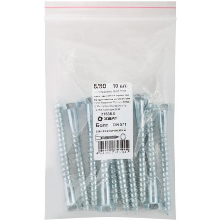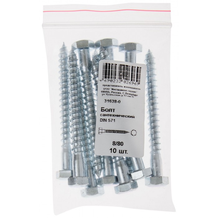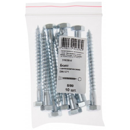 Болт сантехнический 8х80 мм DIN 571, 10 шт 31638-0