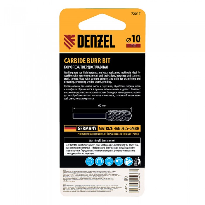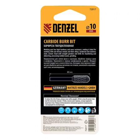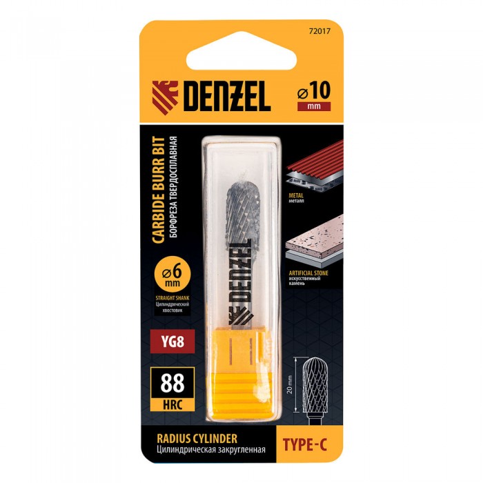 Борфреза по металлу твердосплавная, цилиндрическая закругленная, тип-С, 10 мм Denzel