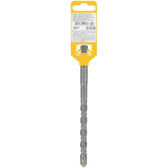 Профи. SDS-PLUS хвостовик. По бетону, камню, кирпичу. Для перфоратора. Для профессионального использования. Износостойкий. W-образная вставка с добавлением 8% кобальта для лучшего позиционирования на поверхности. Двойная спираль для быстрого отвода материала и охлаждения корпуса бура. Материал: легированная инструментальная сталь, твердосплавная вставка из карбида вольфрама ВК8С. Упаковка: пластиковый подвес.