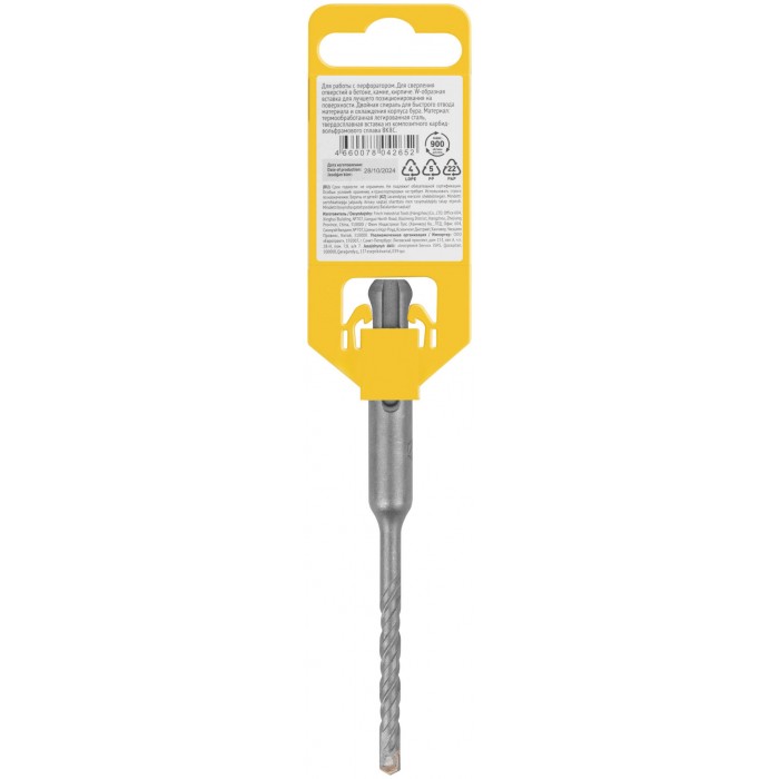Профи. SDS-PLUS хвостовик. По бетону, камню, кирпичу. Для перфоратора. Для профессионального использования. Износостойкий. W-образная вставка с добавлением 8% кобальта для лучшего позиционирования на поверхности. Двойная спираль для быстрого отвода материала и охлаждения корпуса бура. Материал: легированная инструментальная сталь, твердосплавная вставка из карбида вольфрама ВК8С. Упаковка: пластиковый подвес.